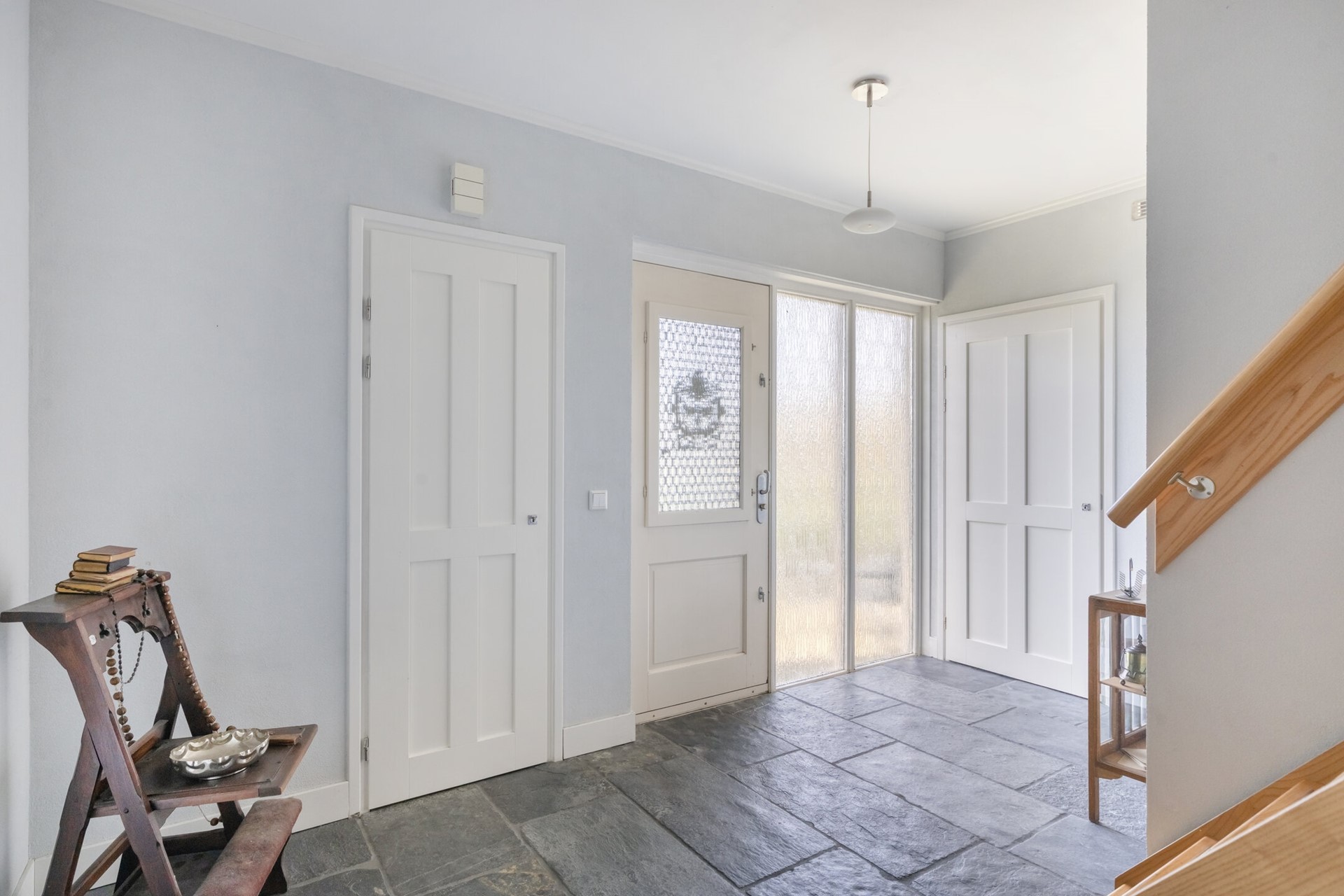 Entree met trapopgang, toegang tot de woonkamer met serre en keuken met inbouwapparatuur en kookeiland, bijkeuken met witgoedaansluitingen.