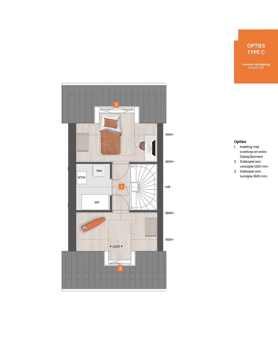 Maak van deze nieuwe woning écht jouw thuis met de beschikbare opties. Met bijvoorbeeld een aanbouw van 1,20 meter of 2,40 meter en openslaande tuindeuren maak je de woonkamer nóg groter en lichter. Van de tweede verdieping kun je een volwaardige woonverdieping maken door diverse opties. Met de keuze voor dakkapellen aan de voor- en achterzijde én de indelingsoptie, creëer je hier twee kamers én een wasruimte.