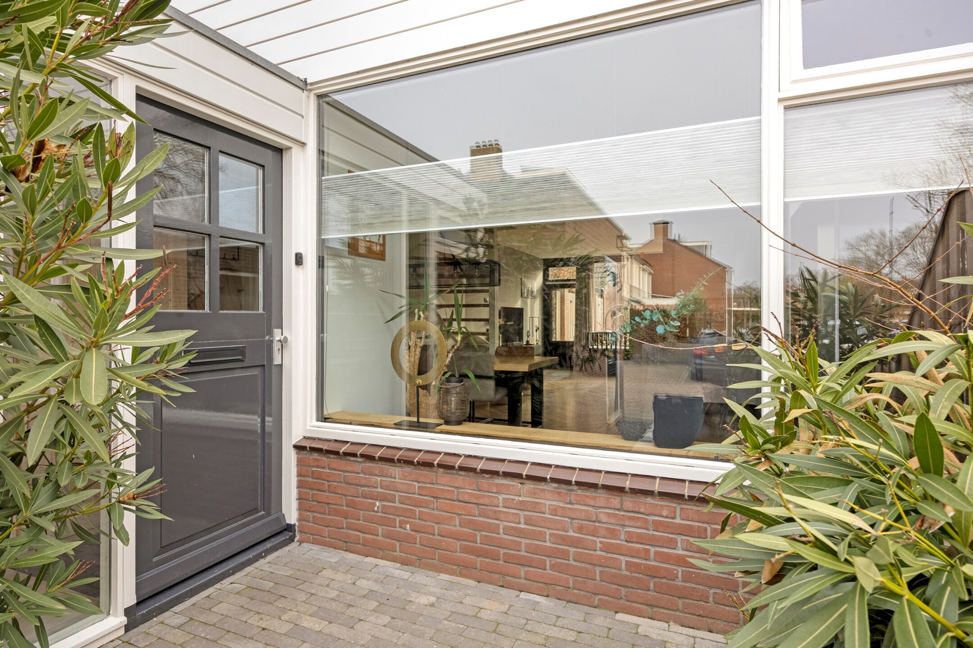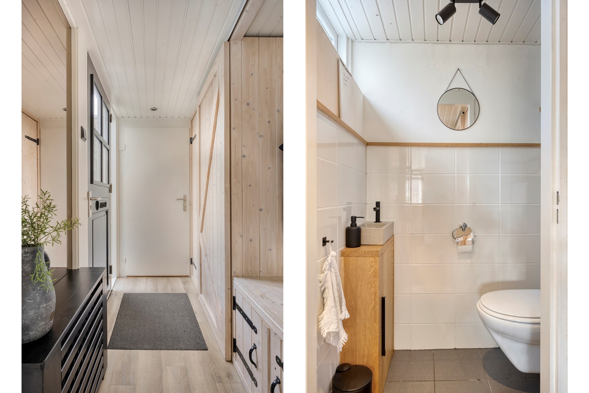 Aan de voorzijde tref je de stenen berging. Entree met het toilet, meterkast en toegang tot de keuken. Daar vindt je de trapopgang naar boven en de woonkamer.
