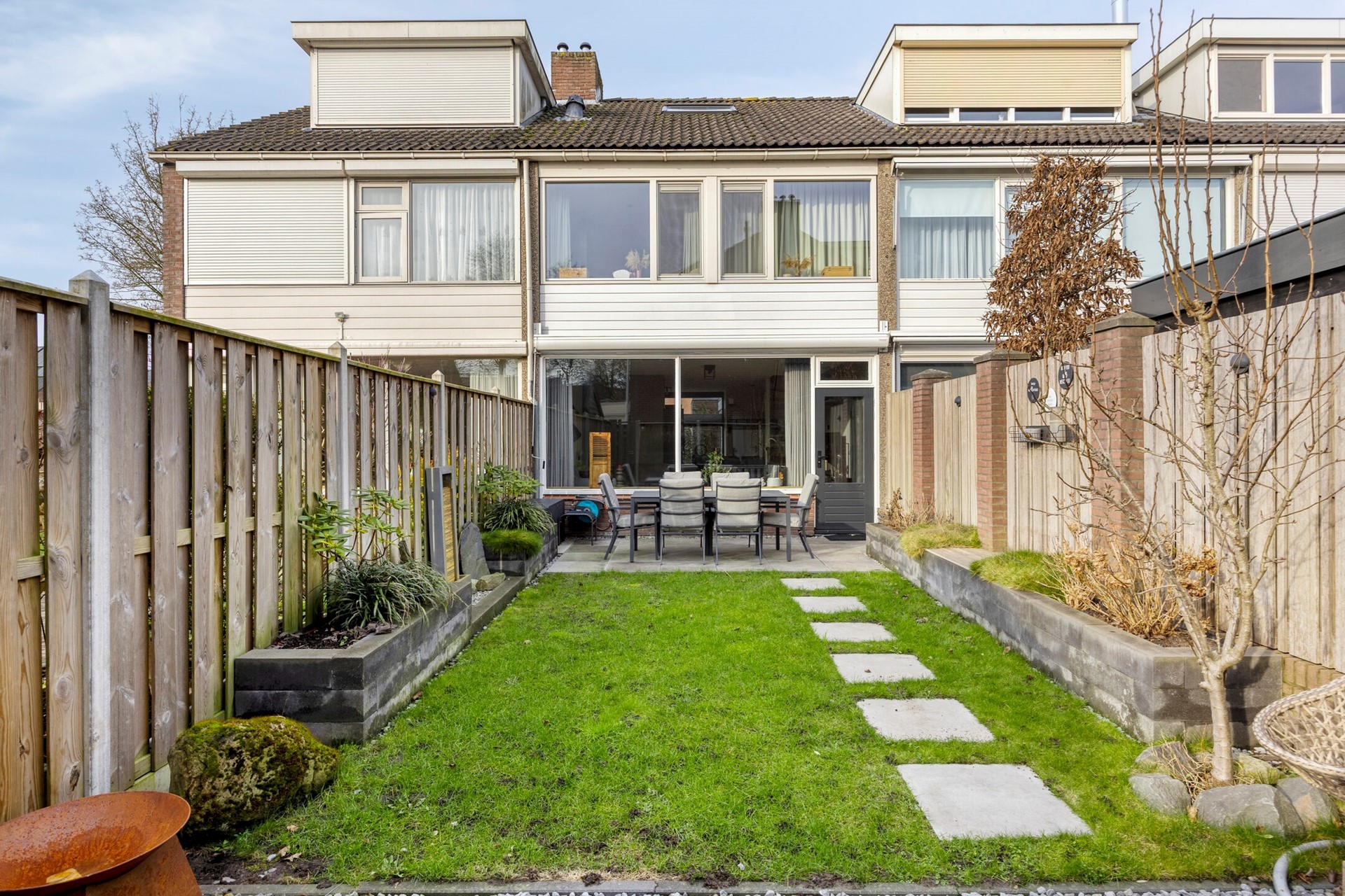 De tuin op het oosten is via een achterom bereikbaar en groen en onderhoudsvriendelijk aangelegd.