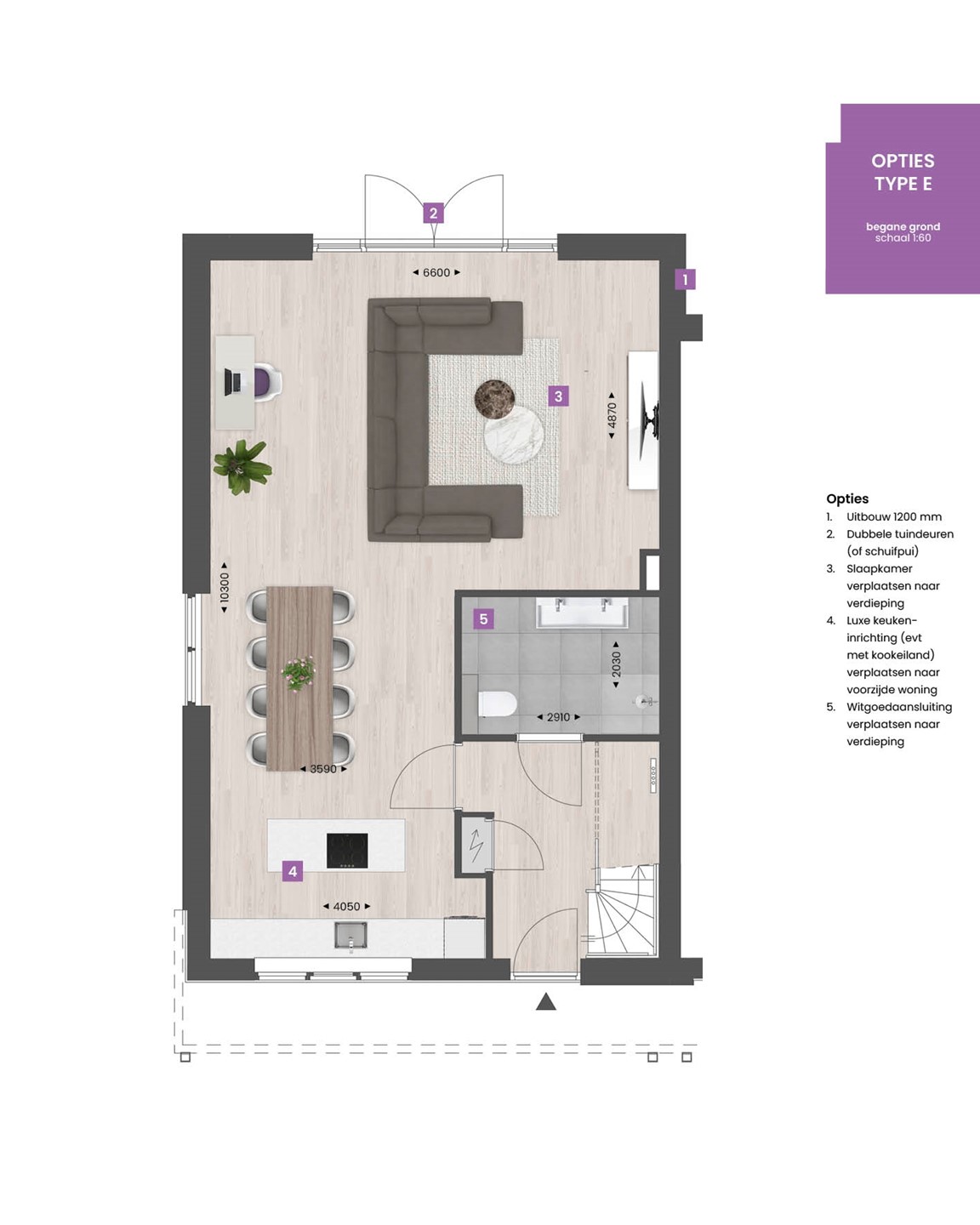 Er zijn meerdere mogelijkheden om deze woning helemaal naar wens aan te passen via opties. Wil je nóg meer leefruimte? Dan kun je de slaapkamer bij de woonkamer voegen, kun je kiezen voor een praktische wasruimte bij de techniekruimte op de eerste verdieping en een ruime doucheruimte op de begane grond. Op de verdieping kun je met de optie voor een dakkapel aan de voor- en/of achterzijde veel extra ruimte en lichtinval in de slaapkamer(s) creëren.