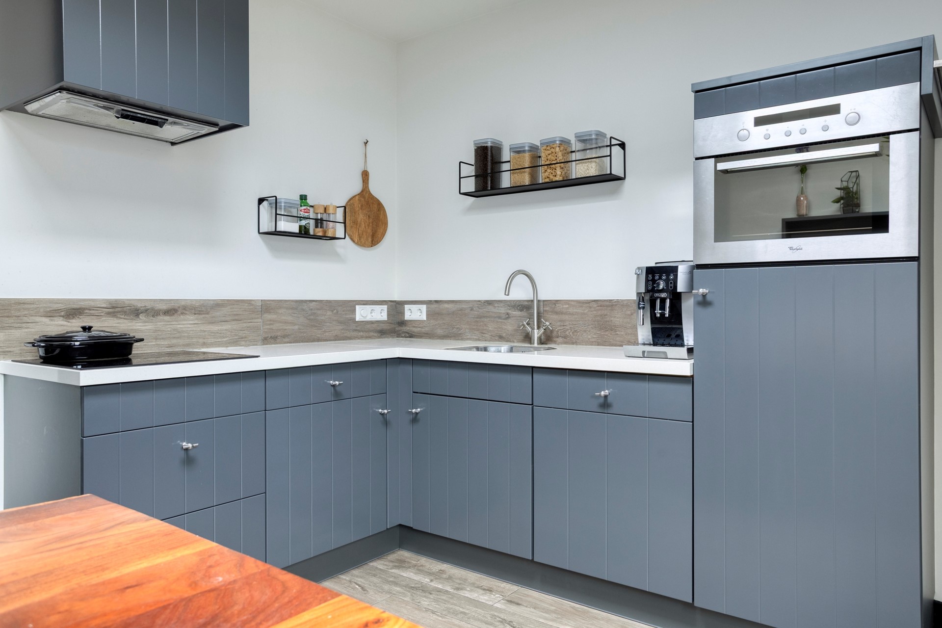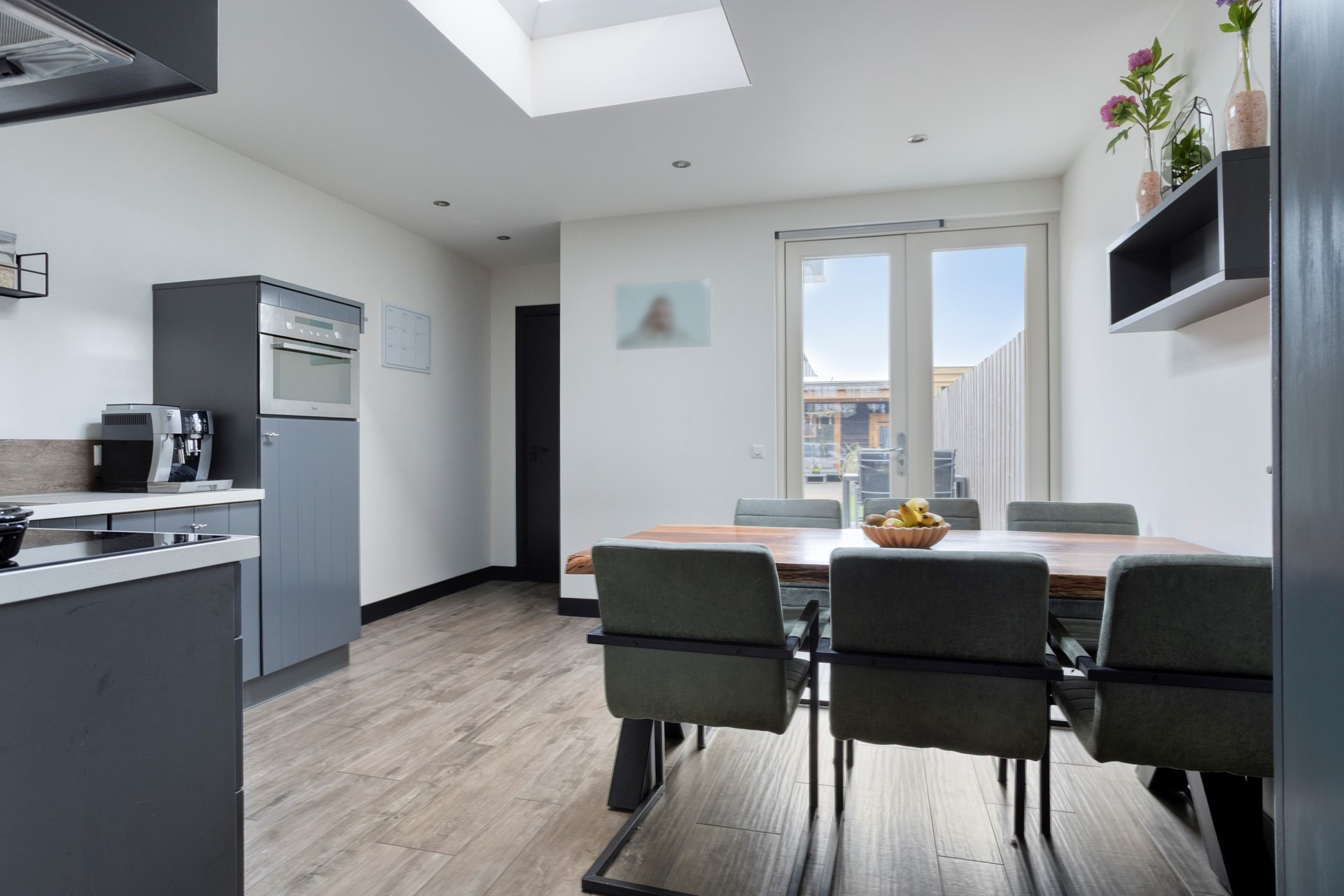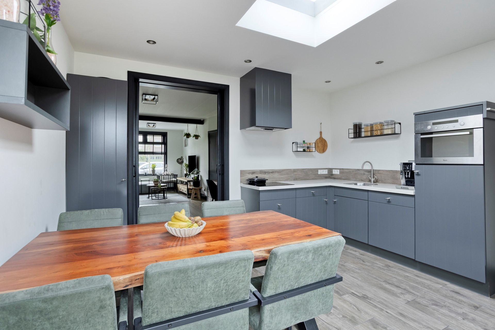 De woonkeuken is geplaatst in een hoekopstelling en voorzien van diverse inbouwapparatuur. Vanuit de keuken loop je zo de tuin in. Ook is hier toegang tot de wasruimte met plaats voor de wasmachine en droger, met daarachter nog een toilet.