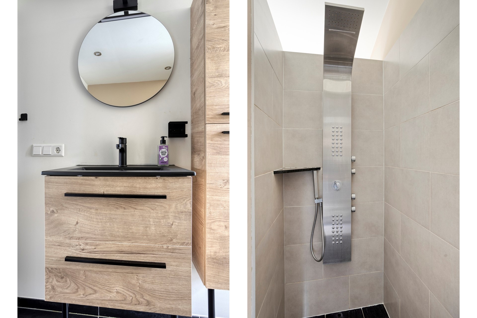 Overloop met twee slaapkamers en badkamer met inloopdouche, ligbad, toilet en wastafel.