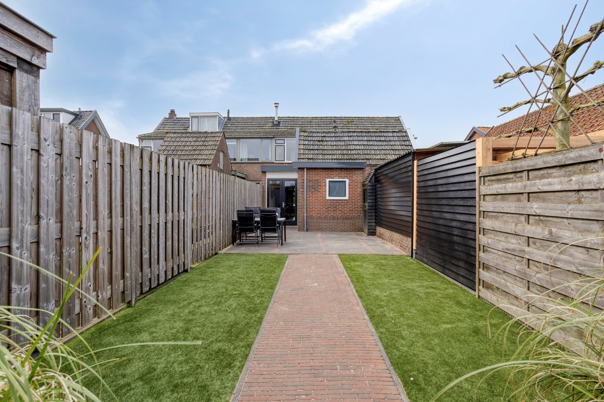De achtertuin ligt op het noorden en is via een achterom bereikbaar. Dankzij de fijne diepte van de tuin kun je hier op ieder moment van de dag genieten van zowel zon als schaduw. Achter in de tuin vind je een fraaie veranda met daarachter een ruime schuur.