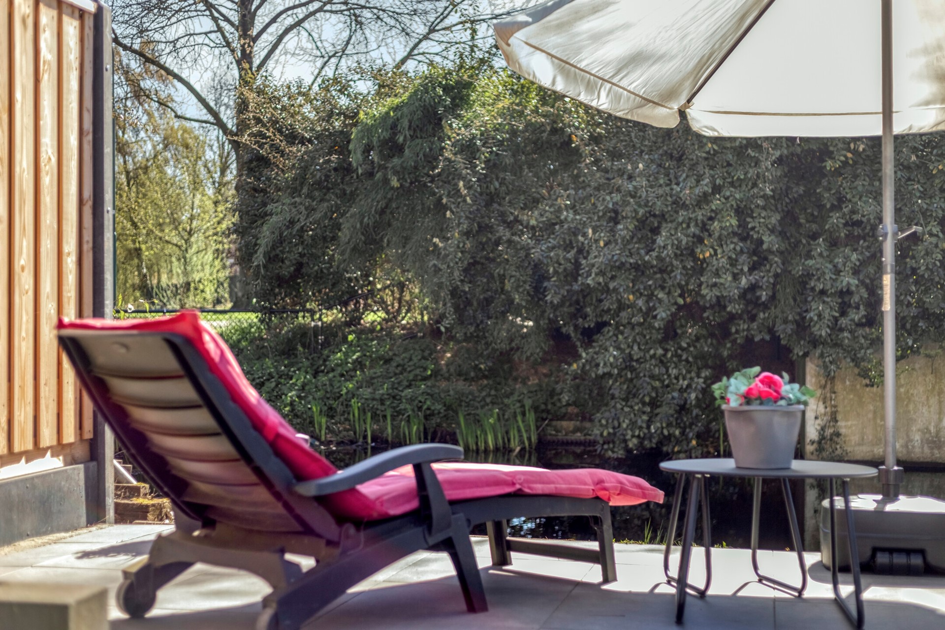 Fraai aangelegde achtertuin gelegen op het zuid-westen, met veel privacy, groen en meerdere terrassen waaronder één aan het water.